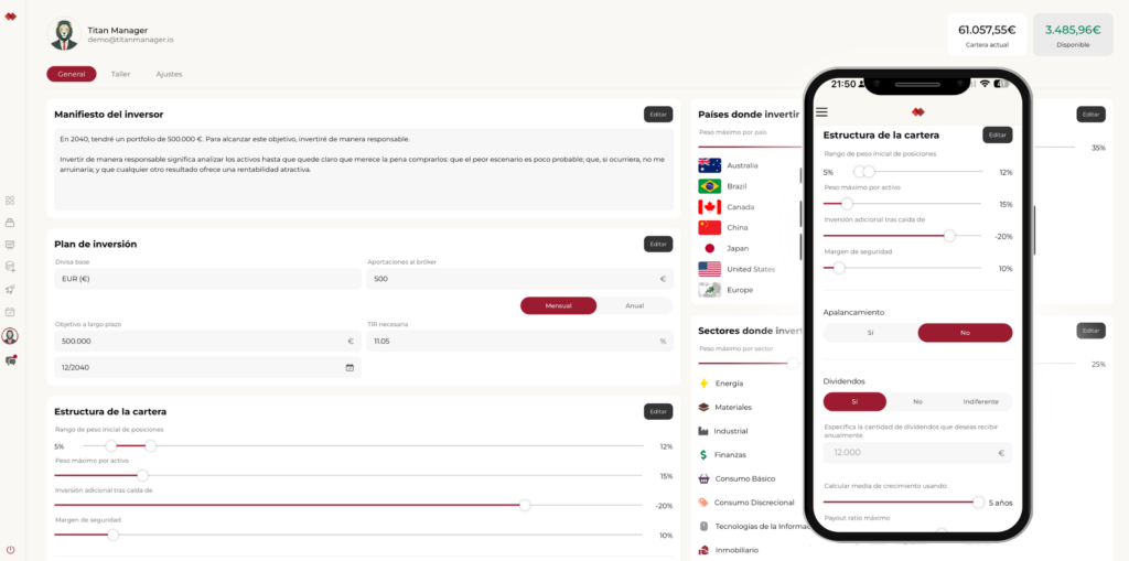 Establece los pesos objetivo por sector y país. Fija los límites y restricciones que tu cartera debe respetar. Tu portfolio tiene un plano antes de construirse.