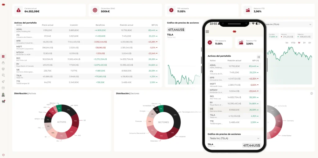 Tu tracker no es una pieza aislada. Cada posición está vinculada a tu plan, a tu tesis de inversión y con posibilidad de optimizarse con un clic. Ves lo que tienes y entiendes por qué lo tienes.